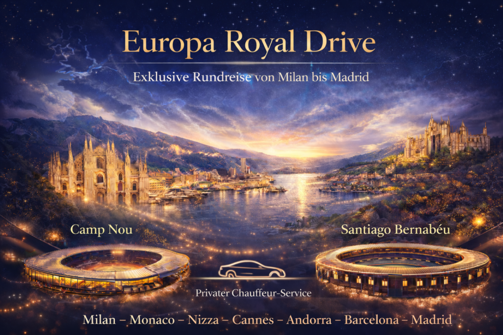 Europa Royal Drive ist eine exklusive 11-tägige Luxusreise von Mailand bis Madrid, konzipiert für Gäste, die Komfort, Privatsphäre und Qualität schätzen. Sie reisen ohne Züge und ohne Inlandsflüge, ausschließlich mit Limousinenservice und persönlichem Chauffeur. Von Mailand über Monaco, die Côte d’Azur, Andorra und Barcelona bis nach Madrid – jede Etappe ist perfekt geplant für ein entspanntes, hochwertiges Reiseerlebnis.
